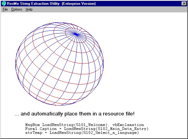 ResMe is a string extraction utility that automatically removes hard-coded strings from your Visual Basic source code, replaces them with a LoadResString() reference, and places the extracted string in a .RES resource file. ResMe makes the first step of localization extremely simple and is superior to old-fashioned ways. Many days of tedious, error prone work can be reduced to a few minutes of automated processing! While ResMe performs about 98% of the work for you, it is necessary to inspect which strings are and aren't being moved to the Resource file.