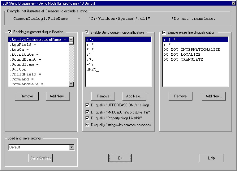 NOTE: These settings be accessed from the menu Options-Edit String Disqualifiers. These string disqualifiers are also displayed when a VBP project is processed.