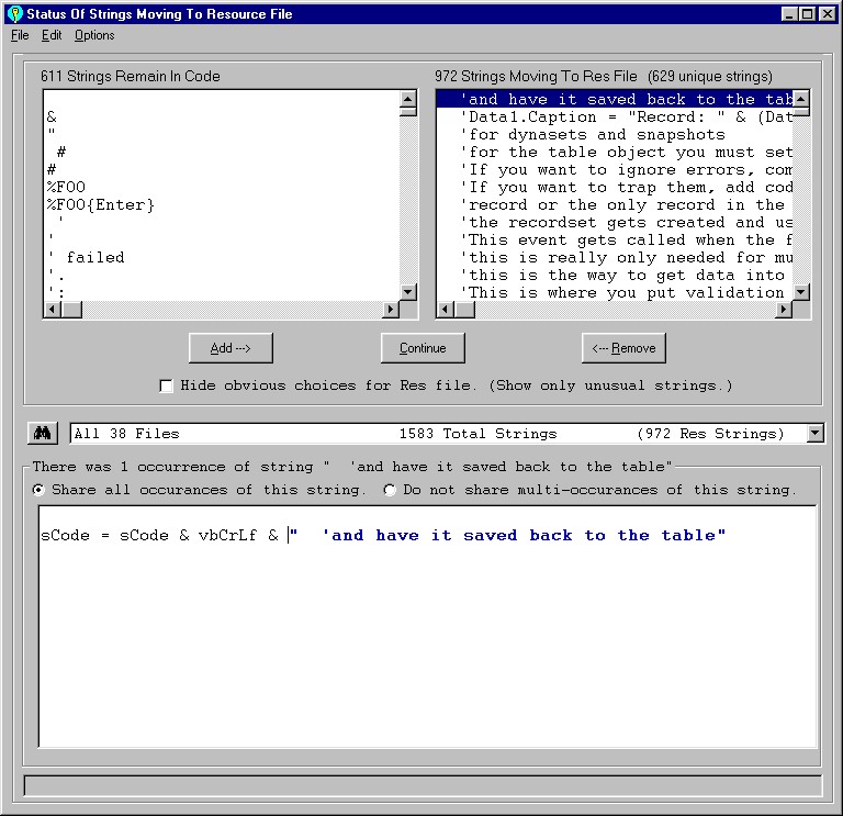 original .RES file. (Doing so would cause a compiler error when the missing string is accessed from the .RES file.) Forcing a status change of a string will override all disqualification keyword phrases for new strings. However, built-in disqualifiers related to things like PropertyBag and Err.Raise cannot be overridden.