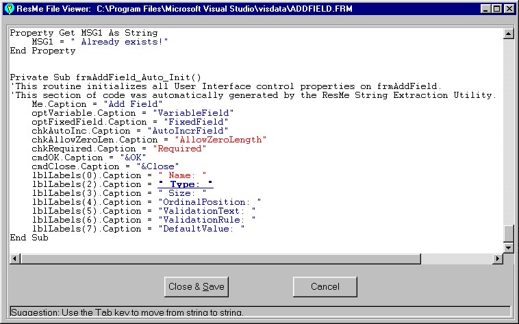 This is a power method of processing strings. Use the TAB key to tab to the next strings. The currently selected string will be in bold. Blue strings will be resource file strings, red strings will remain in source code. Pressing the SPACE-BAR will toggle the state of the string. CTRL-TAB will back up to the previous string.
