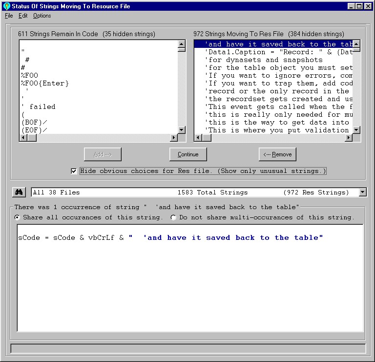 In this example of the Visdata.vbp sample that Microsoft includes with Visual Basic, there are 972 resource strings but only 629 are unique strings that are candidates for being moved to the Resource file. Notice in the second screen how more than half the strings (384 of the 629) are optionally hidden. Most projects will have more than half their strings hidden. In fact, it is common to only see roughly 30% of a project's strings.